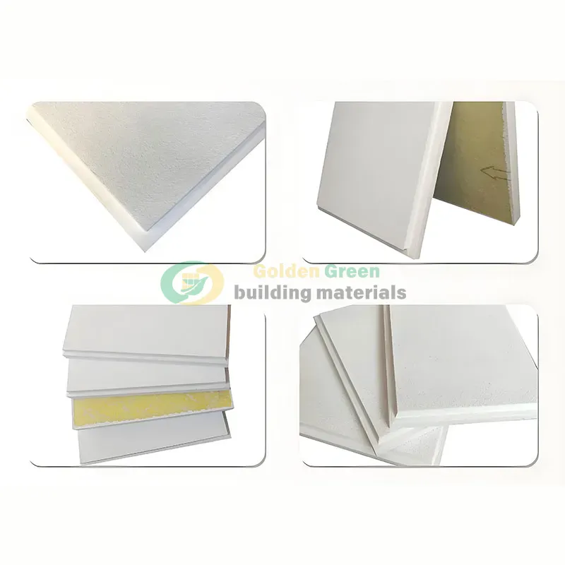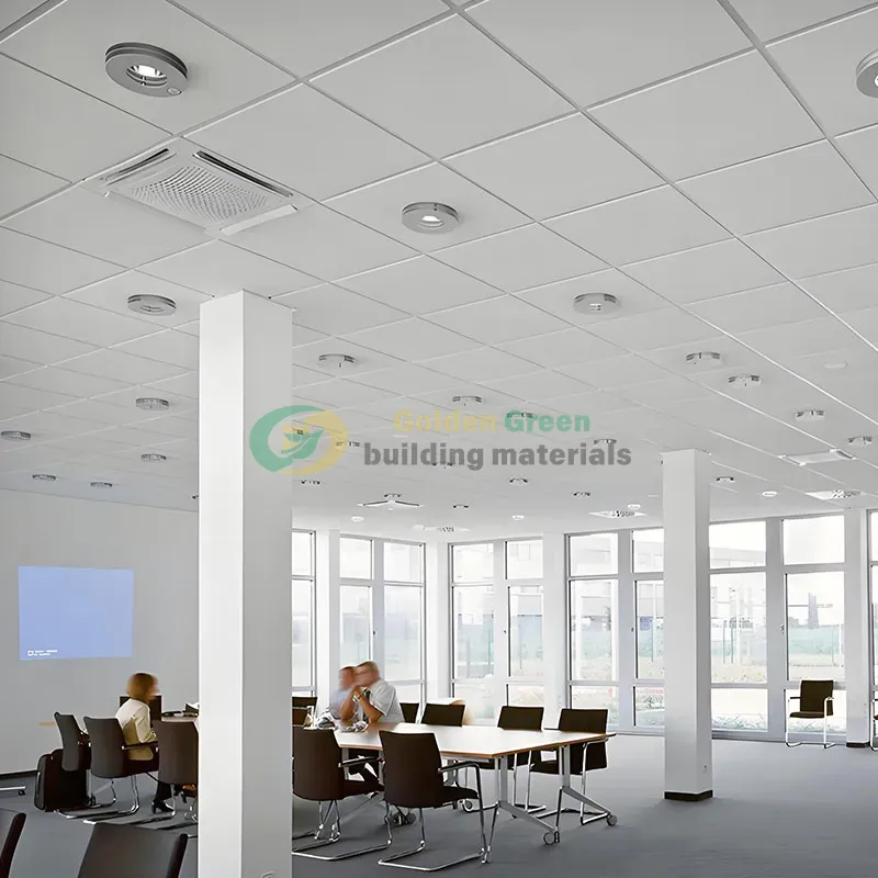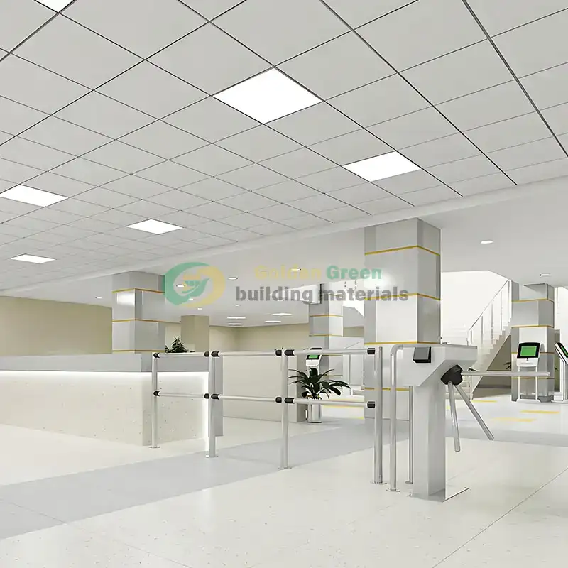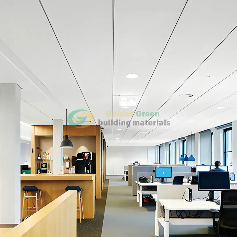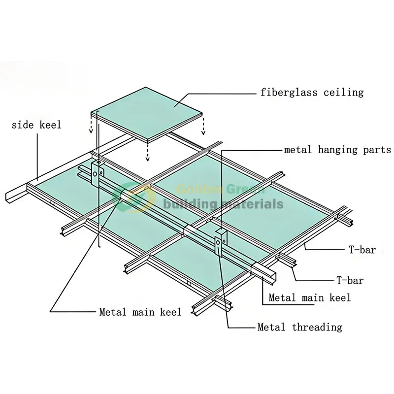 The Golden Green Tegular Edge Fiberglass Tiles are a premium ceiling system that masterfully blends three-dimensional aesthetics with superior acoustic functionality. Each tile is crafted from a high-density fiberglass substrate using a precision-molding process to create its signature Tegular Edge, which provides a distinct sense of depth and dimension.